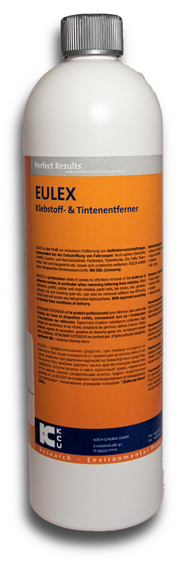 Отлично удаляет с ЛКП чужеродную краску от рисунков «граффити» и свежую краску от дорожной разметки. Очищает ЛКП от приставшей резины, древесной и дорожной смолы. Внутри салона применяется для удаления жирных пятен, жвачки, чужеродной краски на ткани. EULEX не включает в себя галогенные углеводы.