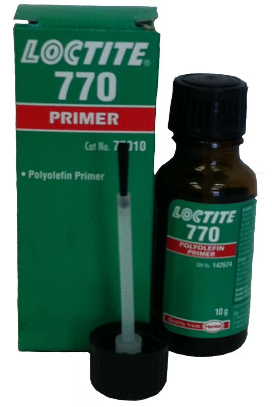 Loctite 770 полиолефиновый праймер – однокомпонентный продукт, быстро сохнущий при комнатной температуре. Задача этого продукта – подготовка полиолефиновых и других материалов с низкой энергией поверхности к склеиванию цианоакрилатными клеями LOCTITE.  На таких подготовленных поверхностях характеристики цианоакрилатных клеев LOCTITE соответствуют приведенным в их спецификациях значениям, за исключением некоторых характерных свойств